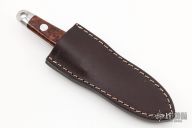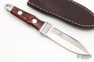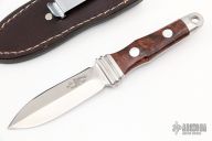 This is a very attractive boot knife from AG Russell. This knife features a double-edged dagger style blade with an integral construction, .140" Blade Stock, .945" Blade Depth.  The handle has burl wood scales.  Includes a brown leather sheath. Has a couple of very light scratches, otherwise excellent condition.