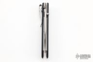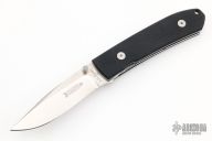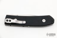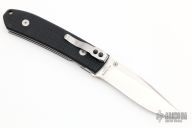 This Dozier Designed Tab Lock Folder by A.G. Russell features a satin finish blade with notched thumb ramp and a single thumb stud. The handle has black G-10 scales, stainless steel liners and tip down clip. Excellent condition.
