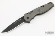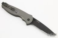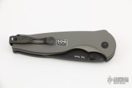 This assisted opening knife by SOG features a black partially serrated blade with dual thumbstuds. The handle has a textured anodized aluminum construction with a black stainless steel tip up clip. Comes with a nylon belt sheath. Has some light scuffs, otherwise excellent condition.