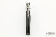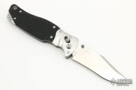 This SOG TomCat Axis Lock Folder has a VG-10 blade with dual thumb studs and a notched thumbrest. Handle is black rubber with satin finished stainless steel bolsters over stainless steel frame with notched thumb rest and black fiber back spacer. Has lanyard hole. Comes with SOG nylon velco sheath. Excellent condition. Still has the plastic covers on the bolsters.