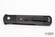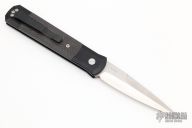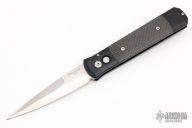 "The Godfather automatic knife represents the influence of original Italian Stiletto style auto knife and Pro-Tech's modern coil spring precision. Has a satin blade and black aluminum handle with carbon fiber inlays and a tip up black stainless clip. Excellent condition.