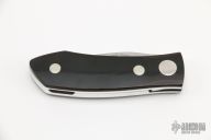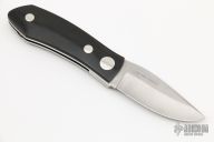 This Barry Wood swing lock folder features a satin finish blade and satin finish stainless steel frame with linen micarta scales. This is a unique scissor opening folder, which when the blade is fully open and locked in place is almost a fixed blade knife. The handle is nicely contoured for a comfortable grip. Opening is accomplished by lighting pressing down and outward at the rear indentation on the spine, which releases the locking pin and allows one side of the handle and the blade to rotate down then forward until the blade locks in the forward position. The one side of the handle continues to rotate back until it locks in place. Closing requires the same slight thumb pressure at the indentation to release the locking pin, then the one side of the handle is rotated back and around, catching the blade and aligning both with the other side of the handle in a locked closed position. Includes original packaging and paper work.  Excellent Condition.
