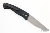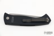 This Medium Brend Auto by Pro-Tech is a Pre-Production Prototype and is #091. It has a bead blasted blade with a false top edge. Handle is black anodized aluminum with a black stainless steel tip up clip. Excellent condition. Comes with a nylon belt sheath.