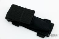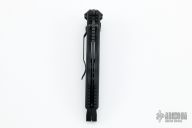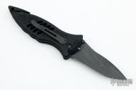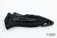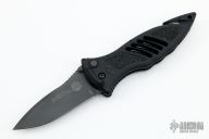 This CQD Mark 1 Auto from Masters of Defense has a spear point black blade with dual thumb studs. Handle is black aluminum with non-slip inserts, reversible black tip down clip, seat belt cutter, lanyard hole and glass breaker. Comes with velcro belt sheath. Has some light scuffs, otherwise excellent condition.