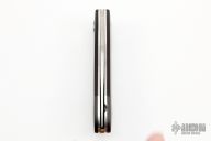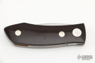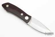 This Barry Wood design swing lock folder features a satin finish blade and satin finish stainless steel frame with maroon linen micarta scales. This is a unique scissor opening folder, which when the blade is fully open and locked in place is almost a fixed blade knife. The handle is nicely contoured for a comfortable grip. Opening is accomplished by lighting pressing down and outward at the rear indentation on the spine, which releases the locking pin and allows one side of the handle and the blade to rotate down then forward until the blade locks in the forward position. The one side of the handle continues to rotate back until it locks in place. Closing requires the same slight thumb pressure at the indentation to release the locking pin, then the one side of the handle is rotated back and around, catching the blade and aligning both with the other side of the handle in a locked closed position.  Has some scuffs and scratches otherwise the knife is in excellent condition.