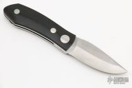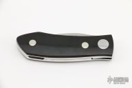 This Barry Wood swing lock folder features a satin finish blade and satin finish stainless steel frame with black linen micarta scales. This is a unique scissor opening folder, which when the blade is fully open and locked in place is almost a fixed blade knife. The handle is nicely contoured for a comfortable grip. Opening is accomplished by lighting pressing down and outward at the rear indentation on the spine, which releases the locking pin and allows one side of the handle and the blade to rotate down then forward until the blade locks in the forward position. The one side of the handle continues to rotate back until it locks in place. Closing requires the same slight thumb pressure at the indentation to release the locking pin, then the one side of the handle is rotated back and around, catching the blade and aligning both with the other side of the handle in a locked closed position. Has light scuffs and scratches throughout, great condition otherwise.