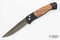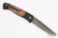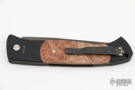 The Walter Brend designed/Pro-Tech collaboration - Brend Auto #1. It features a black coated drop point blade with false top edge. The handle is comprised of black anodized aluminium double bolsters and maple burl inlays over a black anodized frame. Black coated, tip down steel clip and lanyard hole in pommel. Excellent condition. 2nd Production Run #224. Comes with original sheath.