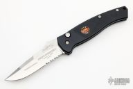 This is a Swift Striker I automatic by Randall King Knives features a mirror polished blade, notched thumbrest and false top edge. Stainless steel clip, tip down carry. Sliding safety on spine of the black aluminum handle. Comes with nylon belt sheath. Has a couple light scuffs, excellent condition otherwise.