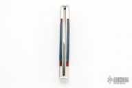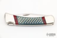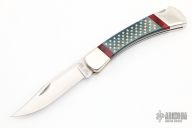 This Buck Model 110 features a satin clip point blade with a single nail nick. The handle has a nickel silver frame with red jasper and wood inlays with stars. Includes original black leather sheath. Has a few light scratches, otherwise excellent condition.