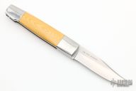 This Barry Wood swing lock folder features a satin finish blade and satin polished stainless steel frame with maroon linen micarta scales. This is a unique scissor opening folder, which when the blade is fully open and locked in place is almost a fixed blade knife. The handle is nicely contoured for a comfortable grip. Opening is accomplished by lightly pressing down and outward at the rear indentation on the spine, which releases the locking pin and allows one side of the handle and the blade to rotate down then forward until the blade locks in the forward position. The one side of the handle continues to rotate back until it locks in place. Closing requires the same slight thumb pressure at the indentation to release the locking pin, then the one side of the handle is rotated back and around, catching the blade and aligning both with the other side of the handle in a locked closed position. Nice function. Has a few light scratches, otherwise excellent condition for age. #874 inside frame. Made in the 1970s.