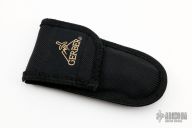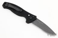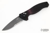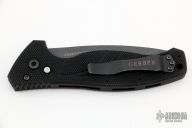 This Gerber Emerson Alliance tactical knife has a black finished 154-CM stainless steel partially serrated drop point blade. Handle is black anodized aluminum with milled scales and notched thumb rest, safety button, lanyard hole, and black stainless steel tip up clip. Comes with original nylon sheath. Excellent condition. This was the first auto that Gerber ever made.
