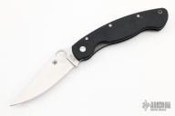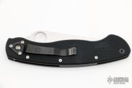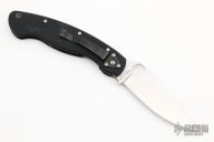 This Military Liner Lock by Spyderco has a satin finished clip point blade with notched thumbrest and thumbhole. Handle is black G10, with stainless steel single liner (lock), black fiber back spacer, stainless steel tip down clip, and lanyard tube pin. Excellent condition. Comes with a Spyderco zippered case.