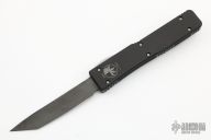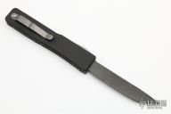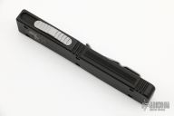 This Ultratech OTF automatic from Microtech features a blast finish standard edge blade with swedge. The handle has a black anodized aluminum handle with stainless steel thumb slide and tip down clip. Dated 11/2002 with a serial number of 0606. Includes padded zipper case. Has a couple light scuffs on the frame, otherwise Excellent condition.