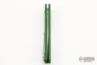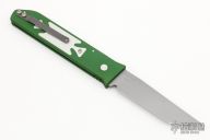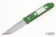 This Jammer by Rob Dalton features a bead blast chisel ground tanto blade and a green aluminum handle with an aluminum inlay. Bead blast titanium clip, tip up carry. Strong and fast coil-spring opening. Numbered 0136 on frame. Comes with nylon belt sheath. Has a couple light scuffs, excellent condition.