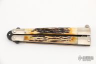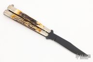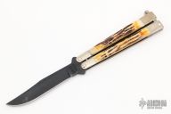 This Balisong by Bear MGC features a black blade. The handles have nickel silver bolsters, stag scales, stainless liners and a stainless steel T-latch. Comes with black nylon sheath. Has some scratches, otherwise good condition.