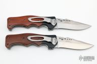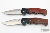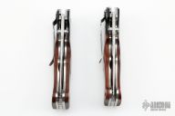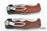 Crawford design. Assisted opening linerlock folder. Satin finished blade with dual thumbstuds. The handle has black G-10 boslters, wood scales, stainless liners and fileworked backspacer. Tip down jeweled stainless clip. Both come with original box, both are in excellent condition.