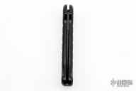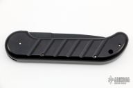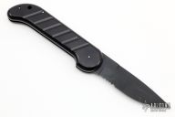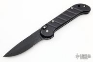 This Ron Miller/Charles Ochs coil-spring automatic features a black partially serrated blade and black anodized aluminum frame with tip up black stainless steel clip. Strong and fast opening. Nice function. Excellent Condition.