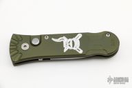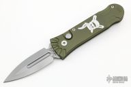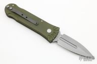 This Small Assassin by Rob Dalton features a bead blasted dagger blade with false top edge. The handle is green anodized aluminum with a tip up titanium clip. Has some light scuffs, otherwise excellent condition.