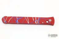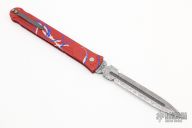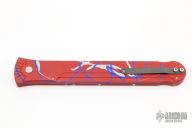 This Splash Assassin by Rob Dalton features a double-edged Damascus blade and a splash anodized aluminum frame. Bead blast titanium clip, tip up carry. Powerful coil spring action. Excellent condition.