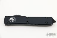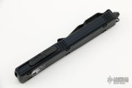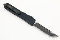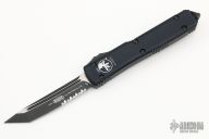 This Ultratech OTF automatic by Microtech features a black tanto partially serrated blade with fullers and satin flats. Handle is black aluminum, marked 01/2020 with a black stainless steel hardware and clip. Comes with original box and papers. Excellent Condition.