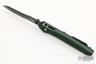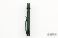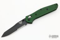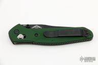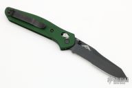 This 940SBK Osborne Axis Lock Folder from Benchmade has a black coated partially serrated blade with false top edge and dual thumbstuds. Handle is green anodized aluminum with purple anodized spacer, and black finished stainless steel tip up clip (RH/LH Reversible). Nice action, blade seating and excellent lockup. Excellent Condition.
