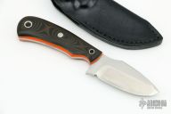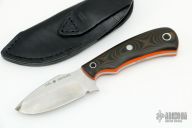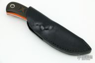 This Badger Fixed Blade by Eric Ochs features a satin finish blade with 0.152" blade stock and 1.329" blade depth. The handle is comprised of full tang construction with g10 scales, orange liners, and lanyard hole in pommel. Includes leather sheath with belt loop. Has some light scuffs and scratches, otherwise great condition.