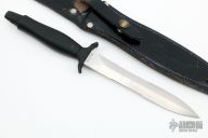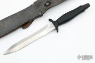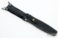 The Mark II is one of the best-selling knives of all time. First introduced in 1966, this tactical knife is serialized for collectors. This one has a satin finished hand ground double-edged partially serrated blade, .234" blade stock and .920" blade depth, hidden tang construction with a black aluminum handle. This knife is Serial #D1203S. Comes with a black leather sheath. Has a few light scuffs/scratches, otherwise excellent condition. Made in 1985. This one has "J deRoode" engraved on both sides of the blade.