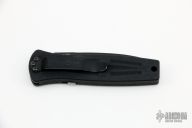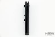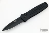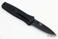 This 3550 Mel Pardue designed side opening auto from Benchmade has a black spear point blade with a false top edge. Handle is matte black finished aluminum with milled contours, spine-thumb safety button, black stainless steel tip down clip, and lanyard hole. Has a few light scuffs, otherwise excellent condition. Comes with a zippered case. Discontinued.