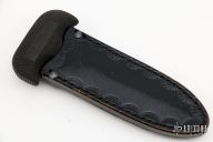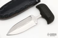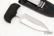 This Terminator Push Dagger by Cold Steel has a satin finished double edged blade with fullers and hidden tang, .186" blade stock, 1.324" depth. Handle is non-slip polymer. Has some light scratches, has been resharpened, the handle is a little loose, otherwise good condition. Comes with a black leather sheath with clip. This was made in the 1980s