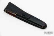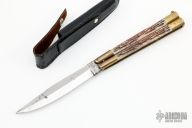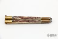 This balisong from the Philippines features a satin finished blade with false top edge.  The handle has brass bolsters and channel/liners, jigged bone scales, brass T-latch. Has some scratches and patina, otherwise good condition. Comes with original leather sheath.