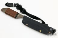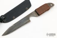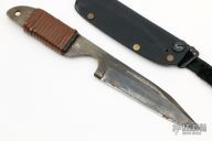 This Street Bowie from Fred Perrin features a clip point chisel ground blade with false top edge and notched thumbrest, .121" blade stock and .937" blade depth, full tang construction. The handle is wrapped and epoxied. Lanyard holes at the butt. Includes kydex sheath. Has some scratches and patina, otherwise good condition.
