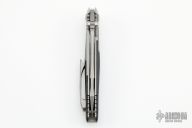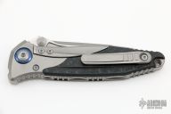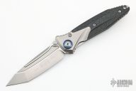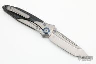 This Socom Bravo by Microtech is made in China by Rike Knife, it features a bead blasted blade, notched thumbrest, and dual thumbstuds. The handle has bead blasted titanium bolsters/liners, blue anodized pivot collars, carbon fiber scales. Tip up carry bead blasted titanium clip. Bead blasted titanium backspacer. Dated 08/2022 and s/n 2181. Comes with original box and papers. Excellent condition.