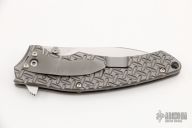 This Pro Series Junkyard framelock flipper by Tim Galyean features a stonewashed drop point blade with flipper. The handle has a milled and bead blasted titanium frame with matching titanium clip, tip down carry, and titanium barrel spacers. Nice lockup, detent, and blade seating. Has some light scuffs and scratches, otherwise excellent condition. #031