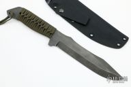 This knife features a chisel ground blade with false top edge, .147" blade stock and 1.377" blade depth, full tang construction with paracord wrap. Comes with a kydex sheath. Has some light scratches, otherwise excellent condition.
