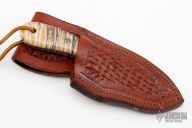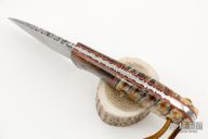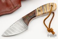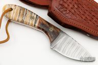 This hunter by RA Matt features a Damascus blade with fileworked spine, .156" blade thickness and 1.416" blade depth, full tang construction. The handle has wood bolsters, mammoth tooth scales with mosaic pins and red liners, fileworked tang spine. Comes with a hand tooled brown leather sheath. Excellent condition.