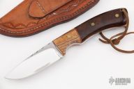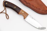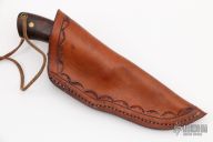 This Hunter by RA Matt features a mirror polished blade with fileworked spine, .154" blade thickness and 1.077" blade depth, full tang construction. The handle has wood bolsters, desert ironwood burl scales with brass pins and red liners, fileworked tang spine. Comes with a hand tooled brown leather sheath. Has some light scratches, otherwise excellent condition.