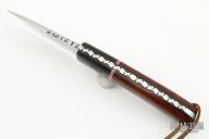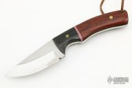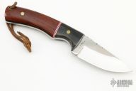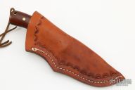 This Skinner by RA Matt features a mirror polished blade with fileworked spine, .157" blade thickness and 1.236" blade depth, full tang construction. The handle has laminated wood bolsters, cocobolo scales with brass pins and black liners, fileworked tang spine. Comes with a hand tooled brown leather sheath. Has some light scratches, otherwise excellent condition.