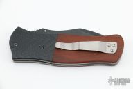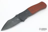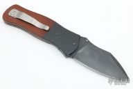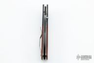This Coffin Nail from Mark Nevling of Burr Oak Knives features a black oxide finished clip point blade with swedge, single thumb stud and notched thumb rest. The handle is comprised of black carbon fiber bolsters and earth micarta scales over titanium liners and a stainless steel backspacer. Titanium tip up clip is positioned for right hand carry. Good blade seating and lock up. Carry mark on pocket clip but otherwise excellent condition. Includes a padded zippered case.