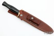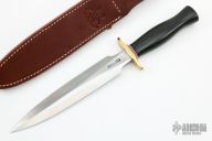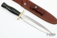 The Model 2-8 by Randall Made Knives is a heavily made dagger or dirk. brass guard, black linen micarta grip, red/white/blue spacers. Double-edged satin finished blade, .186" blade stock and 1.364" blade depth, hidden tang construction. Comes with a brown leather sheath. Excellent condition.