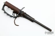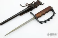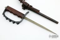 This 1917 Trench Knife by A.C. Co. features a triangular blade shape. The handle is comprised of of a steel "D" guard and wood grip over hidden tang construction. Marks from sheath on blade and a couple marks on handle but overall great condition for it's age. Comes with original scabbard with leather frog and USA crest attached to the frog.