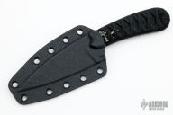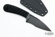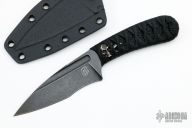 This SIN by Bastinelli Knives features a black finish recurve blade with notched thumbrest and fullers, .136" blade stock and 1.15" blade depth, full tang construction. The handle has a custom black cord wrap a bronzed menuki. Comes with kydex sheath and zippered case. New from maker!