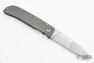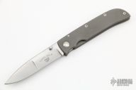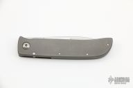 This TTF-6 linerlock folder by Bob Terzuola features a two-tone finished multi-ground blade with a single thumbstud. The handle has a bead blasted titanium frame and liner, black backspacer. Has some scuffs, otherwise excellent condition.