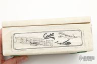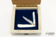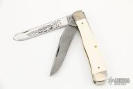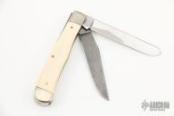 This two-blade trapper by Case has a mirror polished blade with a nail nick and a Damascus blade with nail nick. The handle has nickel silver bolsters, mammoth ivory covers with brass pins and liners and stainless steel springs. Excellent condition. Comes with original stone display box. #190 out of 500