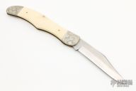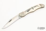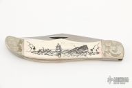 This Slipjoint by Case features a satin finished blade with nail nick. The handle has nickel engraved silver bolsters, scrimshawed bone covers, brass liners and stainless steel spring. Comes with original display box with COA on the back. Excellent condition.