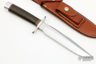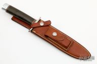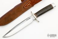 "The Model 1 was made famous by Allied combat troops in World War II and has since been widely used in all theaters of war." This Vietnam Era Model 1-7 has a satin finish blade with sharpened top edge, .210" blade stock and 1.211" blade depth, hidden tang construction. The handle has a nickel silver guard, duralumin butt, green linen micarta grip and red/white/blue spacers (7 spacers). Comes with a tight stitched Johnson Roughback sheath with the late 60's transitional white stone. Has some scuffs and scratches, has been resharpened, otherwise good condition for its age.