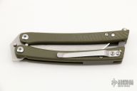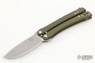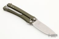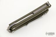 This Model 53 Marlow Mangus has a stonewashed D2 drop point blade with notched thumb rest. Handle is Green G10 with milled contours and titanium back spacers. Polished stainless steel 2-way reversible tip up clip and T-Latch closure. Excellent condition.