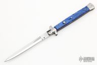 This Swivel Bolster from ACK Italy features a polished dagger blade. The handle is comprised of stainless steel bolsters and pommel and blue pearlex scales over brass liners and steel backspacer. Has a couple light scratches, otherwise excellent condition.