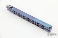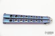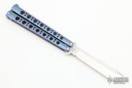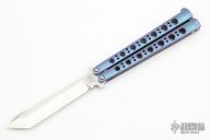 This Model 47 Balisong has a stonewashed tanto blade. Handle is orange peel finished and anodized titanium with a T-latch. Excellent condition.