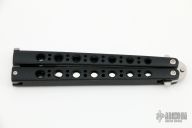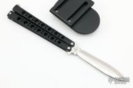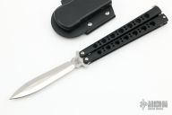 This Model 46 Bali-Song by Benchmade has a dagger blade with a false top edge. Has black coated titanium handles with T-latch. Comes with a molded plastic sheath. Excellent condition.