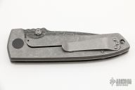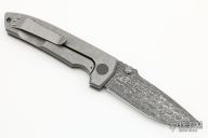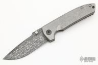 This Project VECP by Les George features a Damascus blade and a stonewashed titanium frame with matching tip up clip. Hinderer lock bar stabilizer. Phosphorus bronze washers. Smooth action. Nice blade seating, detent and lockup. Excellent condition. Comes with a zippered case.